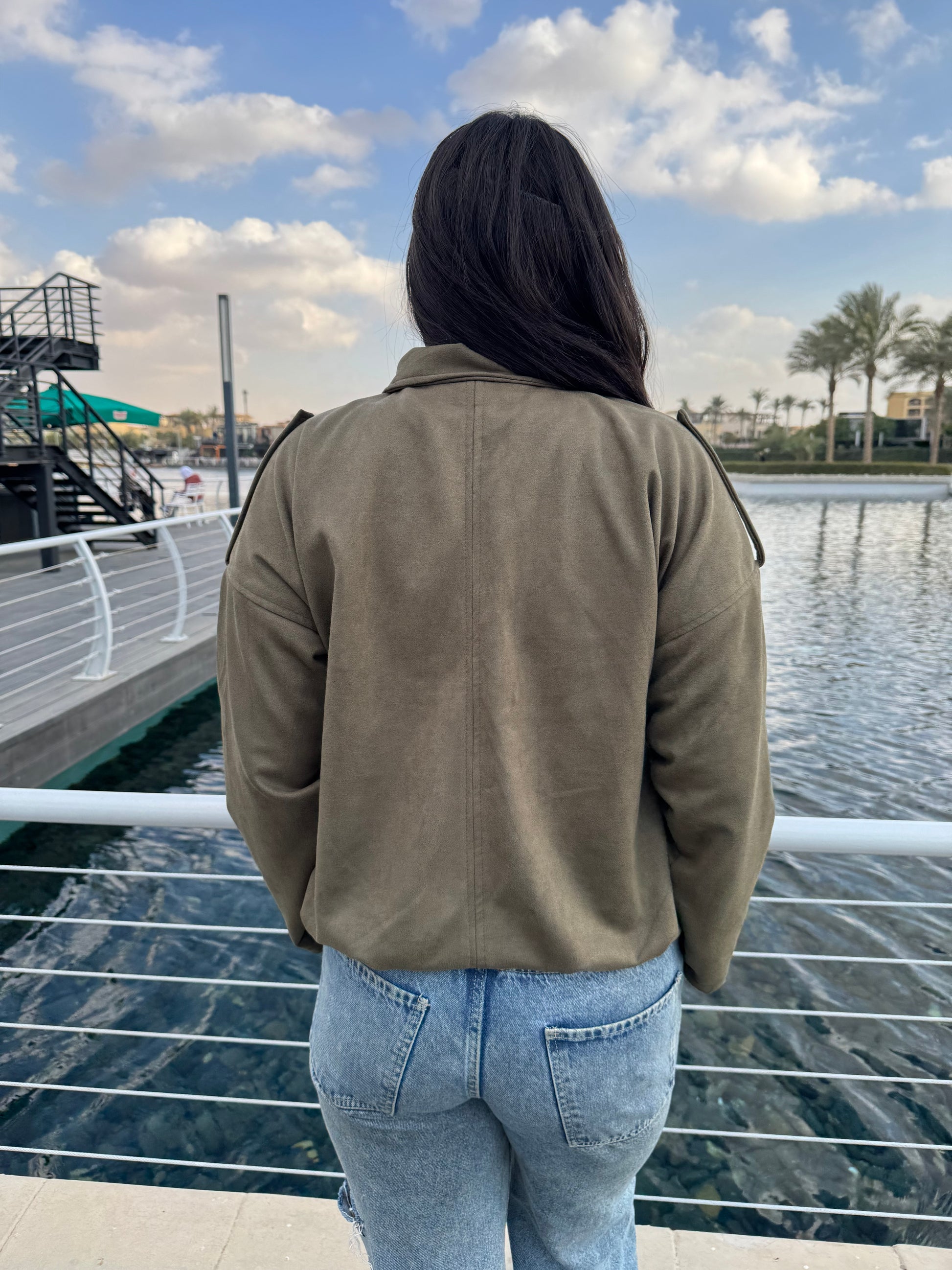 Crafted from soft genuine suede, the Suede Utility Jacket offers a refined balance of structure and ease. Designed with a relaxed yet tailored silhouette, it sits comfortably at the waist to create a flattering, modern shape. The natural suede texture adds depth and sophistication, while the clean collar and snap-button front closure deliver a timeless, polished finish.